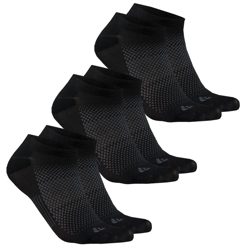 CRAFT CORE Dry Footies 3-pack plní všechny požadavky na sportovní ponožky. Mají extra nízký střih pod kotník a zcela se skryjí v botě. Materiál je tenký, ponožky jsou anatomicky tvarované - rozlišení na levou a pravou a mají zesílenou patu. Téměř nezbytností jsou ploché švy v oblasti prstů. Ponožky jsou složeny z panelů o různé hustotě vlákna pro jednotlivé partie pro maximální komfort. Materiál umožňuje rychlý odvod potu. Obvod chodidel utváří panely ze stretche, který zabrání ponožce v hrnutí. Jsou ideálním sportovním doplňkem i při extrémních sportovních výkonech. Vhodné pro muže i ženy.