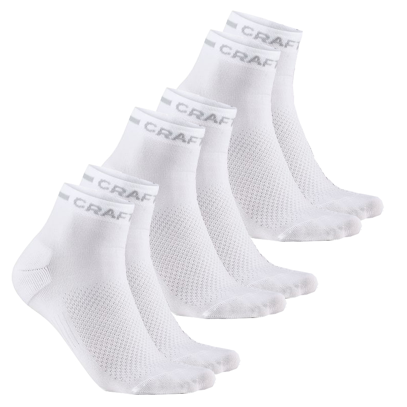CRAFT MID 3-pack plní všechny požadavky na sportovní ponožky. Sahají až nad kotník. Materiál je tenký, ponožky jsou anatomicky tvarované - rozlišení na levou a pravou. Téměř nezbytností jsou ploché švy v oblasti prstů. Ponožky jsou složeny z panelů o různé hustotě vlákna pro jednotlivé partie pro maximální komfort. Materiál umožňuje rychlý odvod potu. Obvod chodidel utváří panely ze stretche, který zabrání ponožce v hrnutí. Jsou ideálním sportovním doplňkem i při extrémních sportovních výkonech. Vhodné pro muže i ženy.
