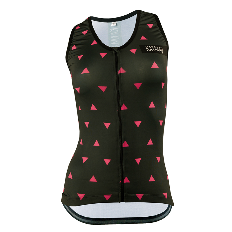 Cyklo tílko KAYMAQ W1-W42 v černé s růžovým vzorem trojúhelníčků. Materiál M-COOL je velice příjemný a lehoučký s jemňoučkou perforací, je prodyšný a rychloschnoucí. Zapínání je na celozip, v horní části s ochranou proti oděru. Výstřih i obvod otvorů na ruce je obšit pružnou černou lemovkou, trikot je tak velice pohodlný a přizpůsobivý. Zadní díl zúžený mezi lopatky. Vzadu nezbytné 3 kapsy do gumy a jedna voděodolná na zip. Zadní díl je delší do obloučku a po celém obvodu z vnitřní strany spodního okraje je pružná guma se silikonovým pružným nesmekovým proužkem.