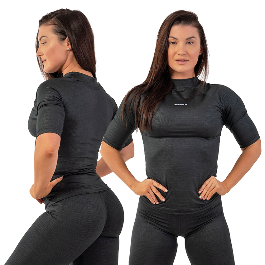 Stylové slim fit tričko v designu hadí kůže je opravdu originál. Rukávy mají délku nad loket, zajímavý je lehký stojáček a raglánové rukávy zajistí, že dobře padne. Materiál je funkční, pružný a dobře odvádí pot. Jeho velkou předností je i to, že je odoný proti oděru. Tričko je z funkčního materiálu, který dobře odvádí pot a i když je super do fitka i pro vysokou zátěž, působí velmi luxusně. Na prsou je malé reflexní logo NEBBIA.